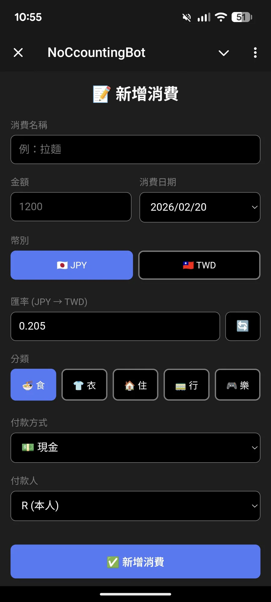 選了 Golang + HTMX + Templ,以 Telegram Mini Apps 作為前端界面,資料庫則是直接串 Notion,好處是回國後可以直接在 Notion 上做查詢、篩選與視覺化,不需要再另外匯出。整個開發花不到一天,功能很簡單:選幣別(JPY/TWD)、輸入金額、選分類(食衣住行樂)、選付款人,送出後直接寫進 Notion 的 database。
